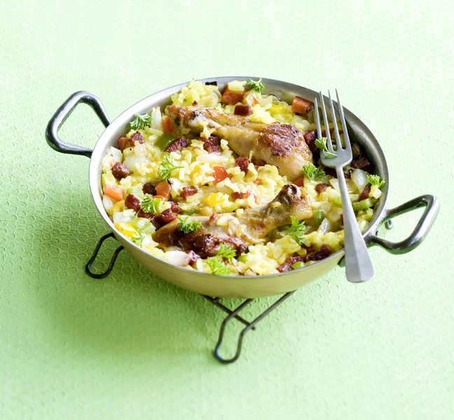 Voeg ui, knoflook en paprika’s toe en bak kort mee. Voeg de rest van het paprikapoeder en de kurkuma (of saffraan) toe en bak 1 minuut. Voeg de rijst toe en roer 3 min. totdat alles goed gemengd is. Voeg de bouillon en chorizo toe, breng aan de kook en laat zachtjes 5 min. koken. Roer af en toe.